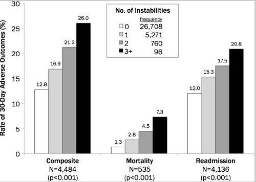 Vital signs are typically measurable such as temperature, heart rate, blood pressure, respiratory rate, and oxygen saturation. Psychiatric patients specifically require more vigorous observation and evaluation since their symptomologies are mostly cognitive and emotional. According to her research published in the Journal of General Internal Medicine, Nguyen states that “people had higher odds of being readmitted or of death within 30 days that correlated with the number of instabilities” (see Figure 1).