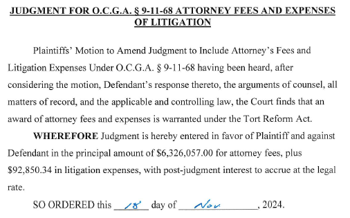 After the entry of a judgment, the Court added $6,326,057 of attorney’s fees and $92,850.34 for case expenses under section 9-11-68.