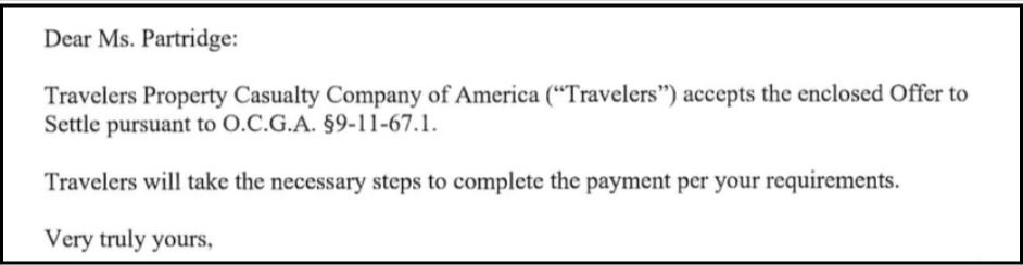 We worked with Ms. Wheeler’s son to develop a plan for his mother’s claim. Thankfully, a $3,000,000 policy was available to cover Ms. Wheeler’s claim. After discussing our options, we chose to send a demand to the insurance company under O.C.G.A. 9-11-67.1, which is the statute that governs Georgia’s pre-lawsuit car wreck settlement demands.